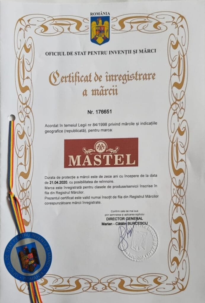 MASTEL este o marcă înregistrată sub nr. 176651, având protecția conferită în conformitate cu Legea nr. 84/1998 privind mărcile și indicațiile geografice din România. Această marcă este protejată pentru o perioadă de 10 ani, începând cu data de 21 aprilie 2020, cu posibilitatea de reînnoire la finalul acestei perioade. Marca este înregistrată pentru clasele specifice de produse și servicii menționate în fila din Registrul Mărcilor.